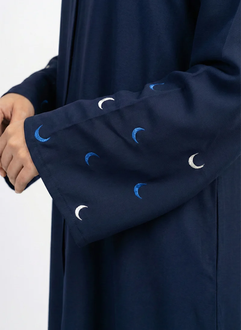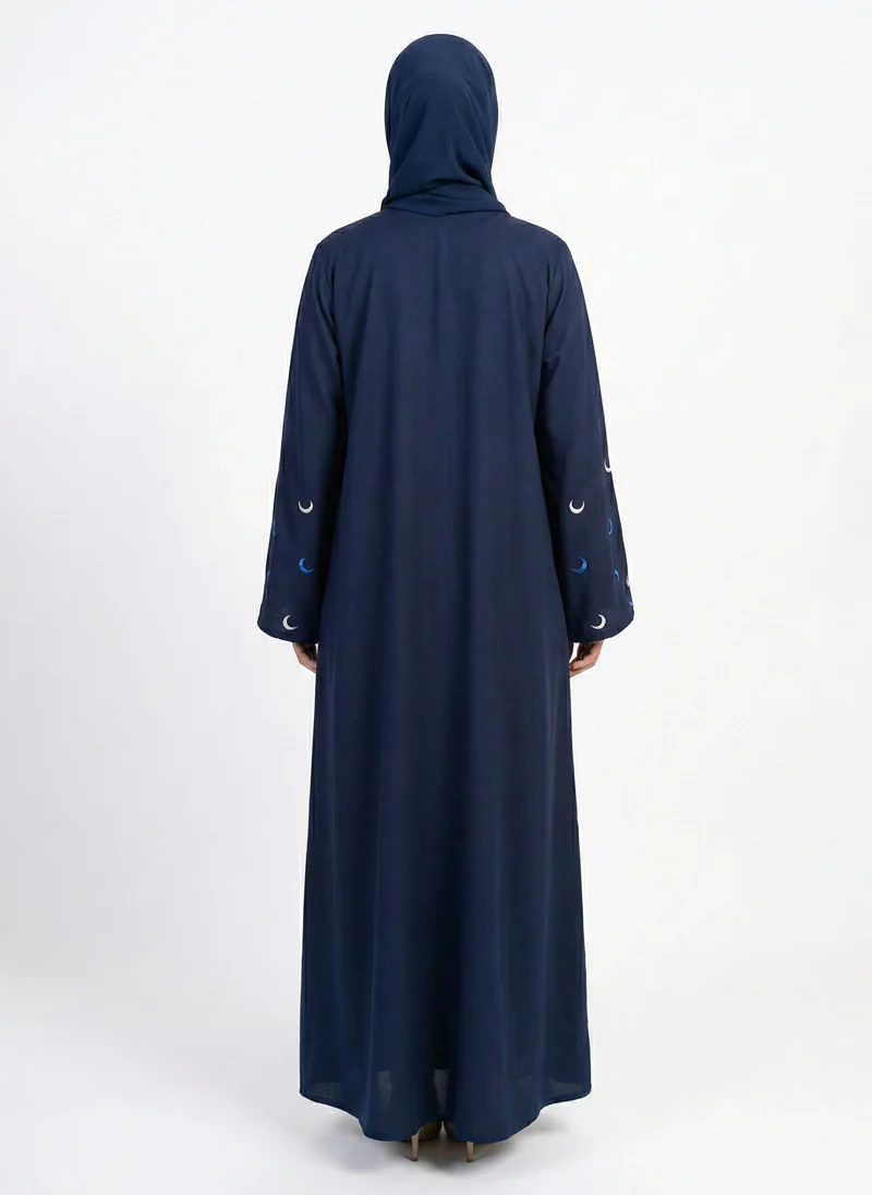 Discover the Arabis Navy Blue Abaya, crafted from silky Nida fabric and featuring elegant crescent moon embroidery on the wide sleeves for a sophisticated look in modest fashion
