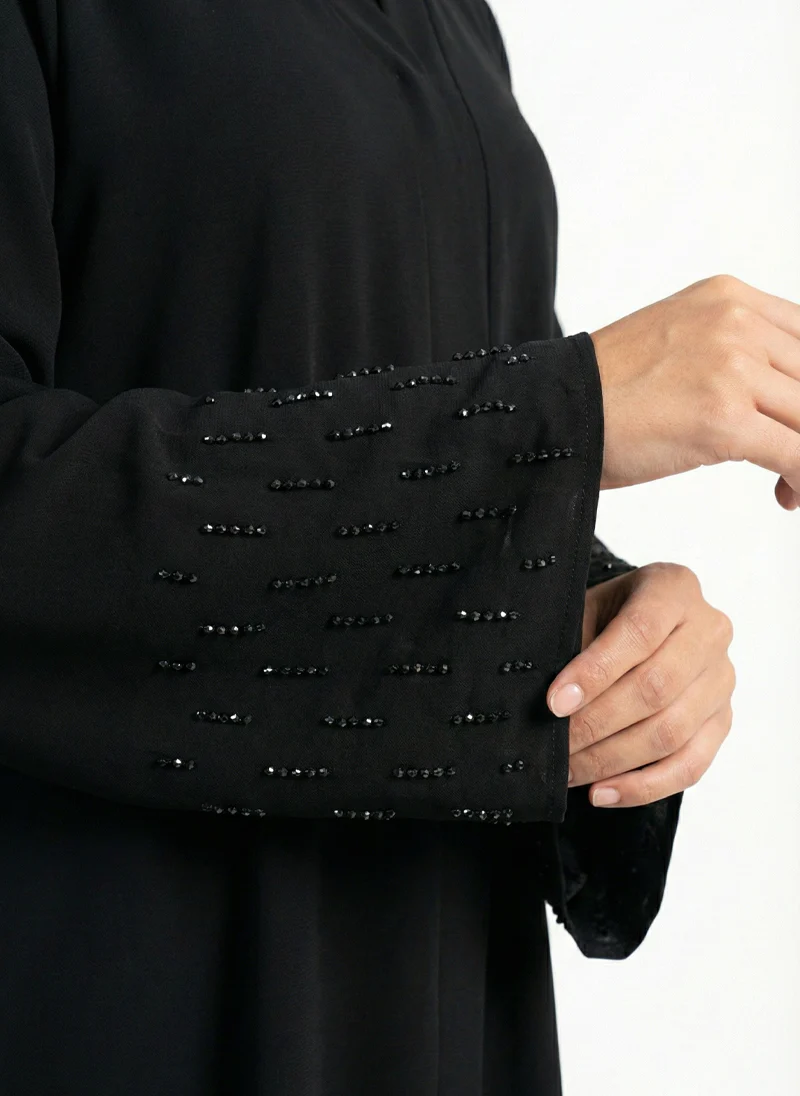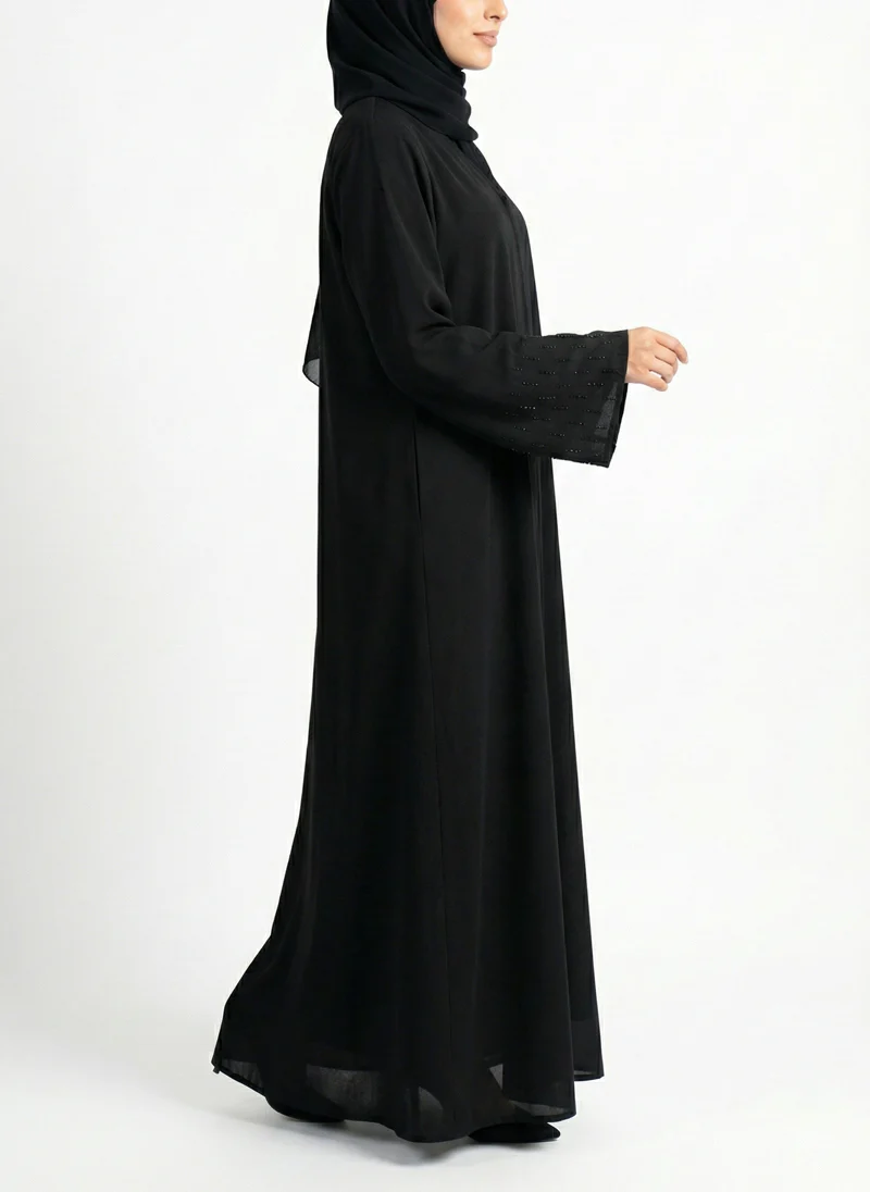 Discover the timeless elegance of the Arabis Black Abaya. Expertly crafted from flowy, premium Nida fabric, this luxury abaya offers a flawless drape, synonymous with high-end Dubai modest fashion