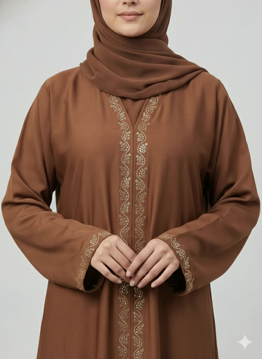 The Arabis Premium Nida Abaya in coffee-brown features soft, flowy Nida fabric with elegant stone-work detailing on the front and sleeves—perfect for a refined and modest everyday look.