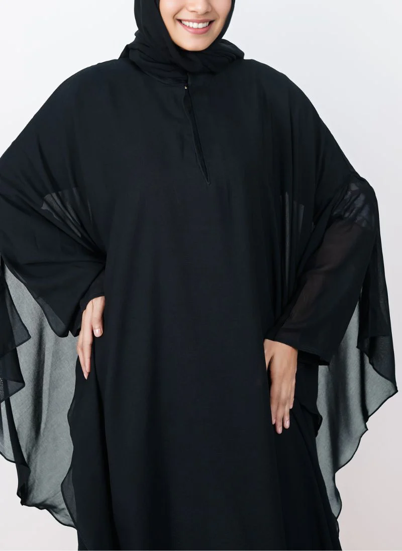 Introducing the Black Chiffon Front Close Jilbab, a Flairy Jilbab Style Abaya made with Superior Ultra Polyester Wool Chiffon Double Layer Fabric. Enjoy double stitched and surged durability, perfect for everyday wear. Upgrade your wardrobe with this high-quality, stylish jilbab.