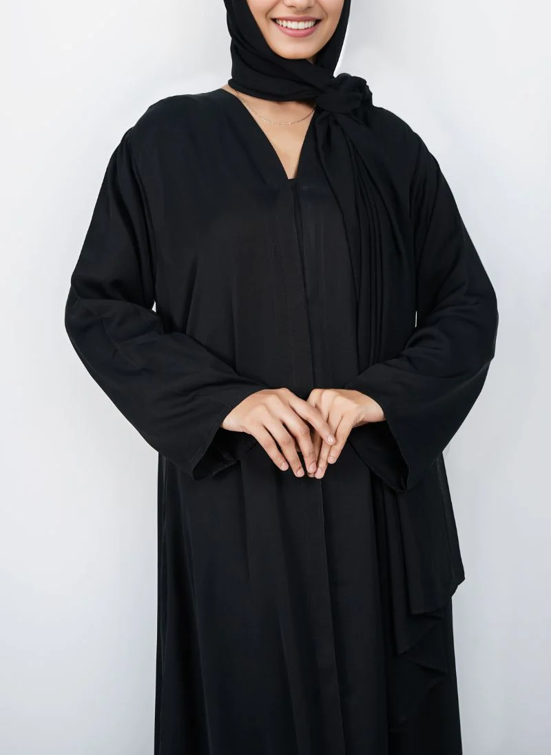 Black Plain Front Open Moss Georgette Abaya. This stylish abaya is made from soft moss georgette fabric that flows nicely and feels comfortable. The front open design makes it easy to wear, and the classic black color goes with everything.