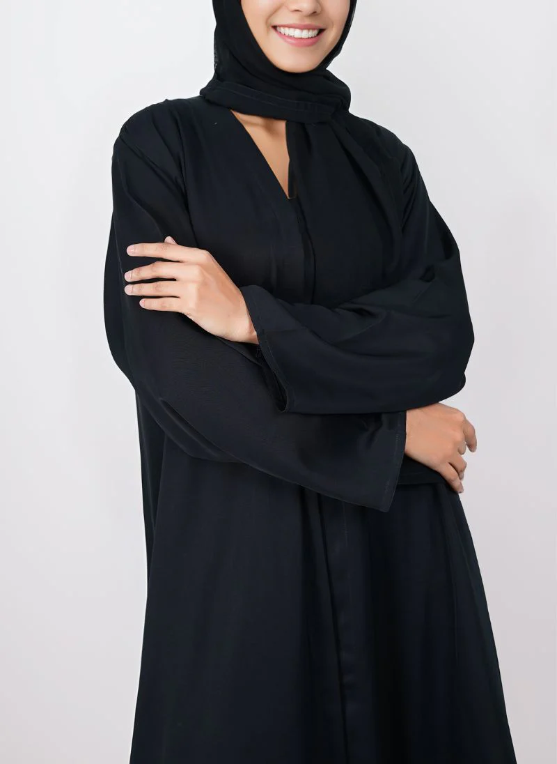 Black Plain Front Nida Fabric Abaya. This stylish abaya is made from Nida fabric that flows nicely and feels comfortable. The front open design makes it easy to wear, and the classic black color goes with everything.