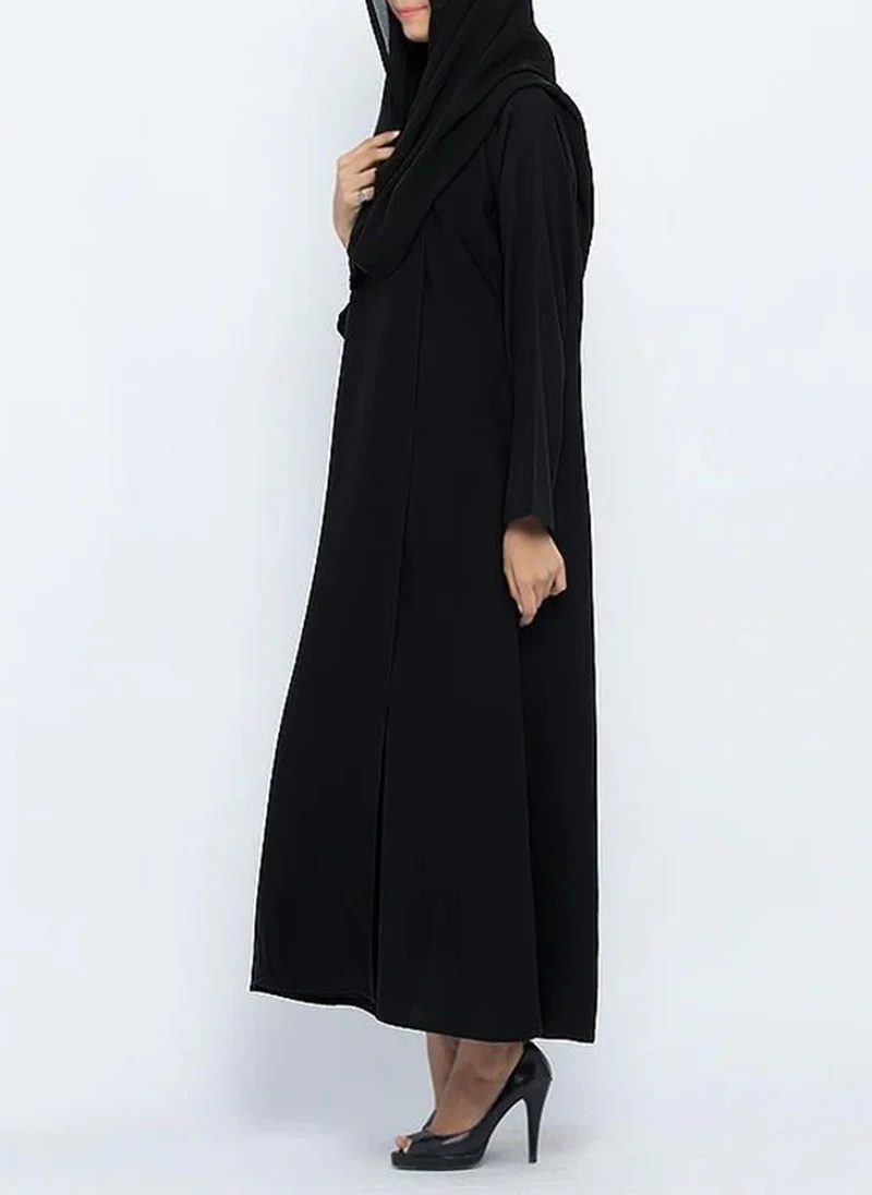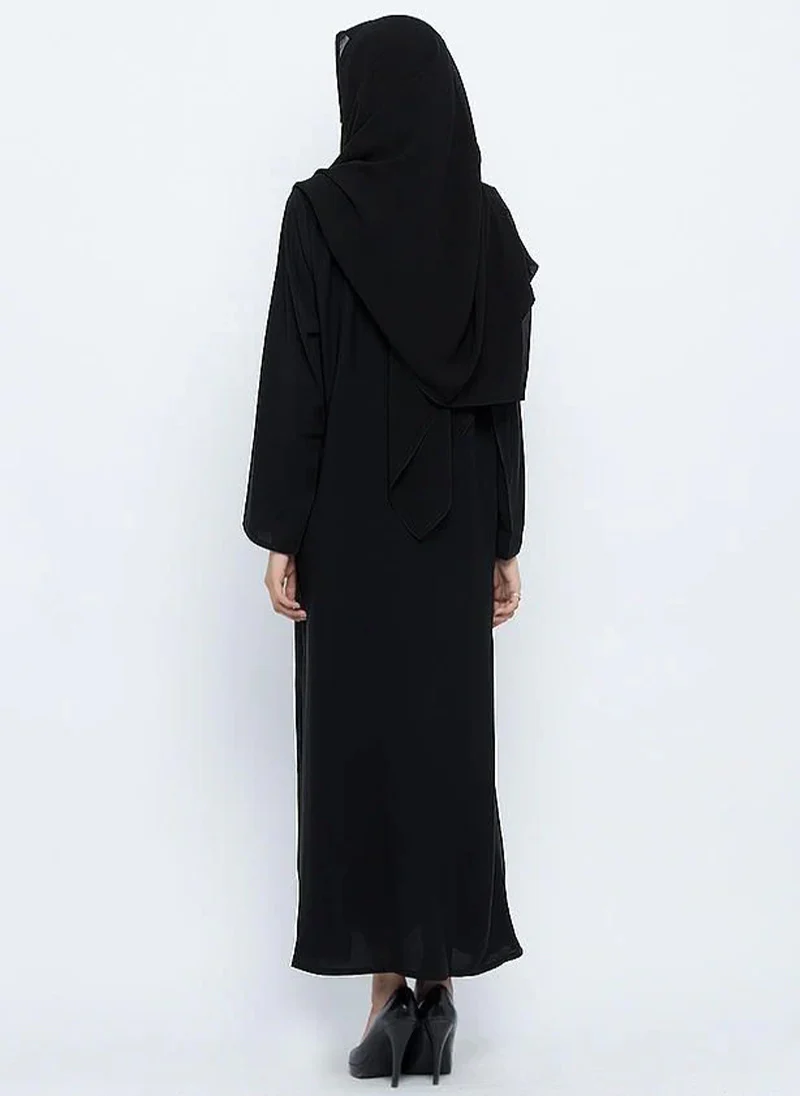 The rich black hue exudes timeless charm, making it a versatile choice for various occasions. The high-quality fabric ensures comfort, while the stylish cut enhances your overall silhouette. With a perfect blend of contemporary style and traditional modesty, the Circular Collar Black Stylish Abaya 0117-P is an essential addition to your collection, elevating your fashion statement with grace and refinement.