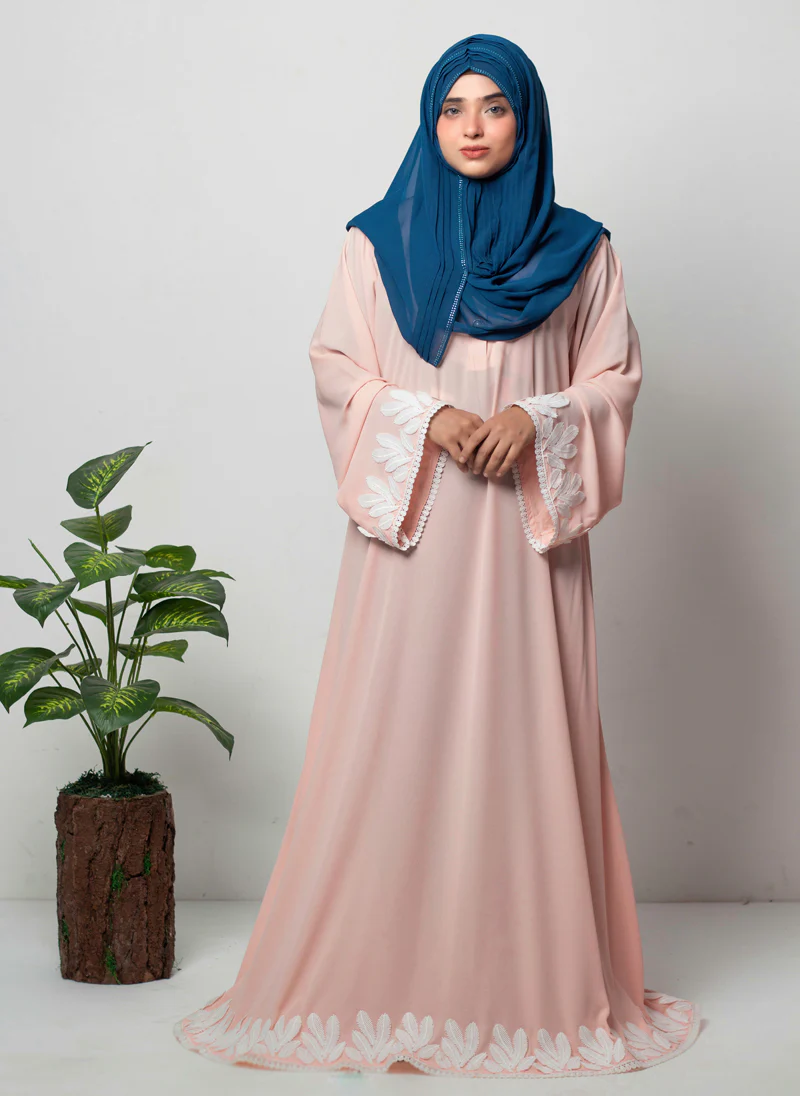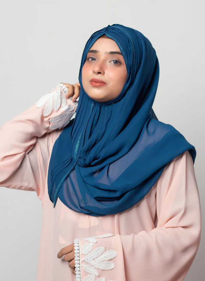 Our stunning turquoise Esha Hijab blends style with functionality. It includes discreet plates which provide a gentle support while maintaining a minimalistic design. This piece is adorned with delicate silver dots along the border, which adds a touch of beauty and elegance.