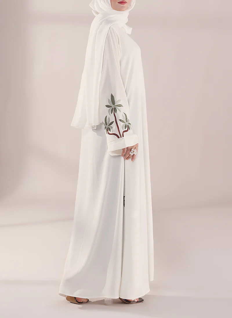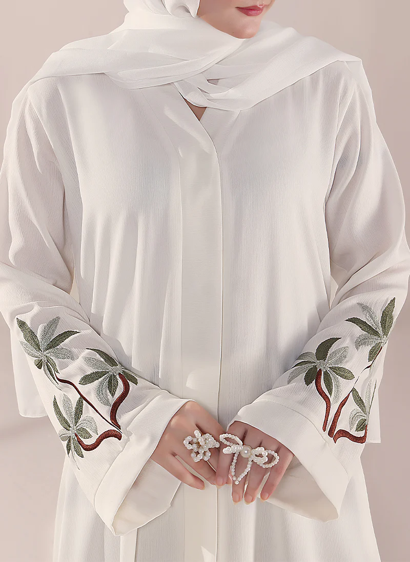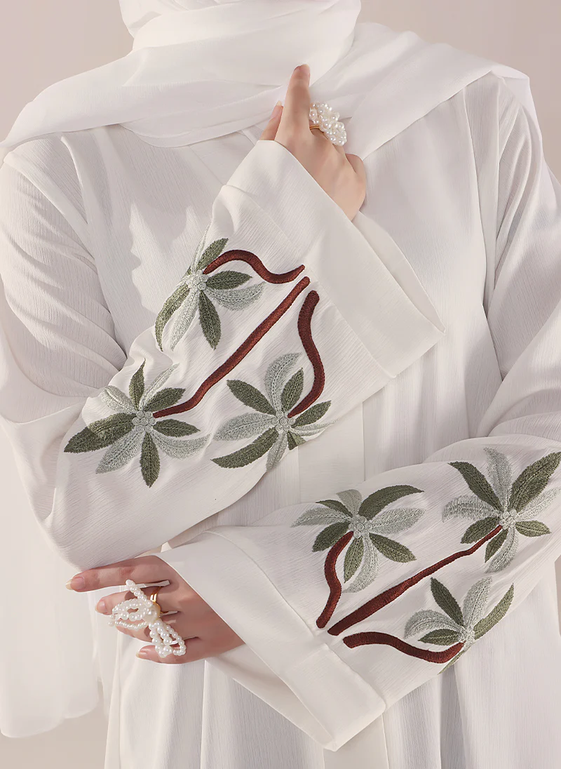 Elevate your modest style with Hijab Ul Hareem’s Front Open Embroidered Abaya, crafted from premium Zoon fabric for a soft, elegant drape. Beautiful floral embroidery on the sleeves adds charm and sophistication to your look. Perfect for every graceful occasion.