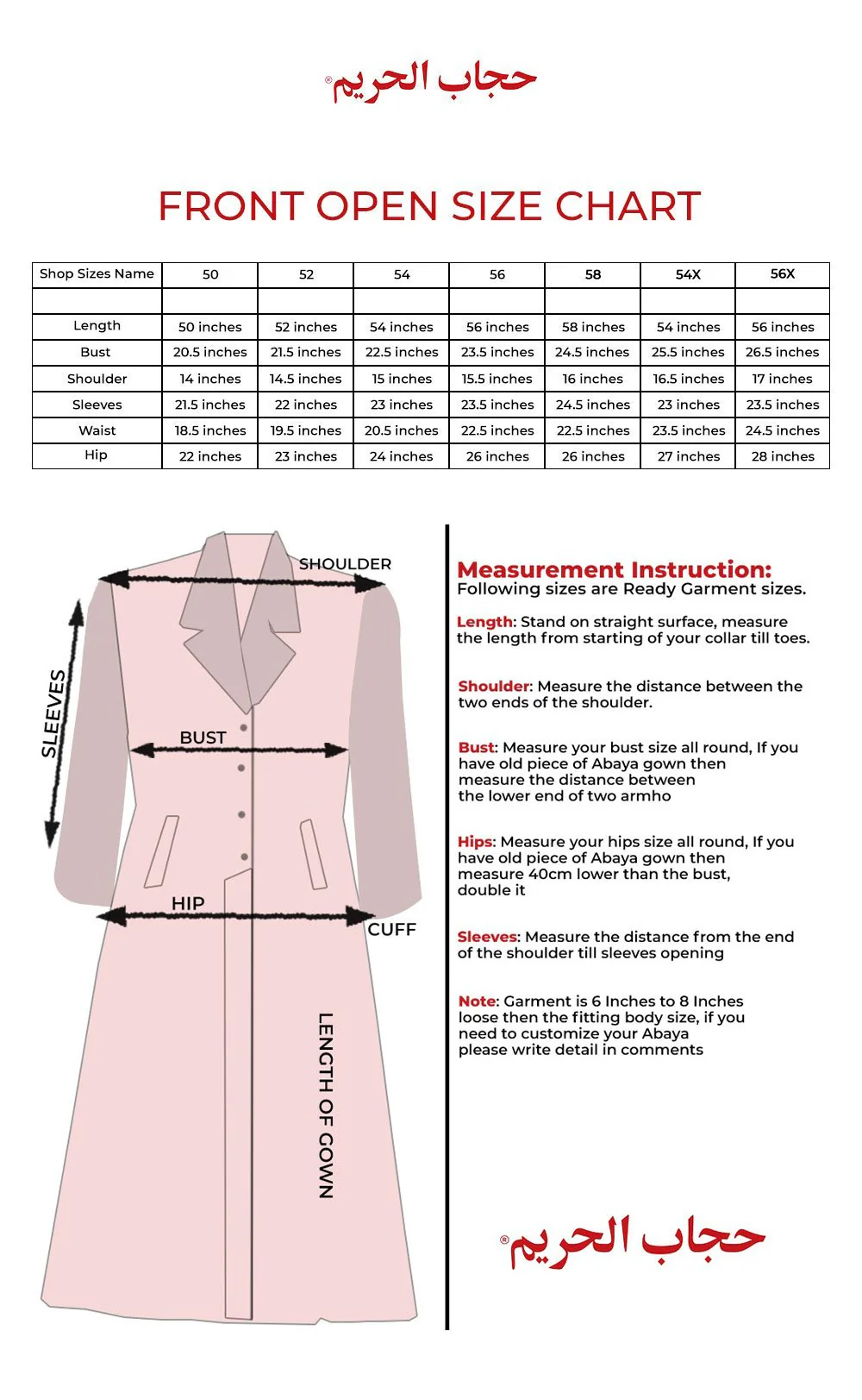 All Abaya of Hijabulhareem are customized and specially manufacture on consumers demand, if you want to customize the Abaya e.g. Fabric colour which is not listed below, Embroidery Colour, Stone Colour or Size, you can write it in description. We will confirm regarding Abaya customization possibilities and charges via email.