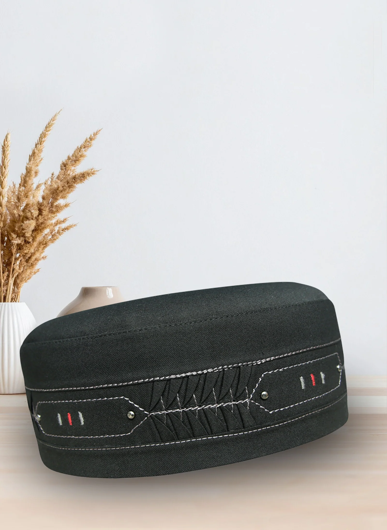 Introduce the Hijab-Ul-Hareem Inayat Koofi is a stylish and traditional Islamic cap, crafted in premium black fabric with fine white and red thread embroidery. Its elegant stitching and soft structure make it perfect for daily wear, prayer, and special occasions. Lightweight and comfortable, this koofi adds a graceful touch to your Islamic attire while ensuring a perfect fit.