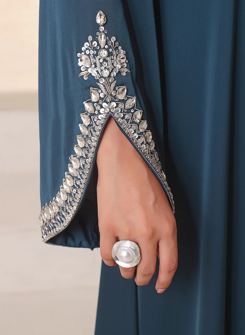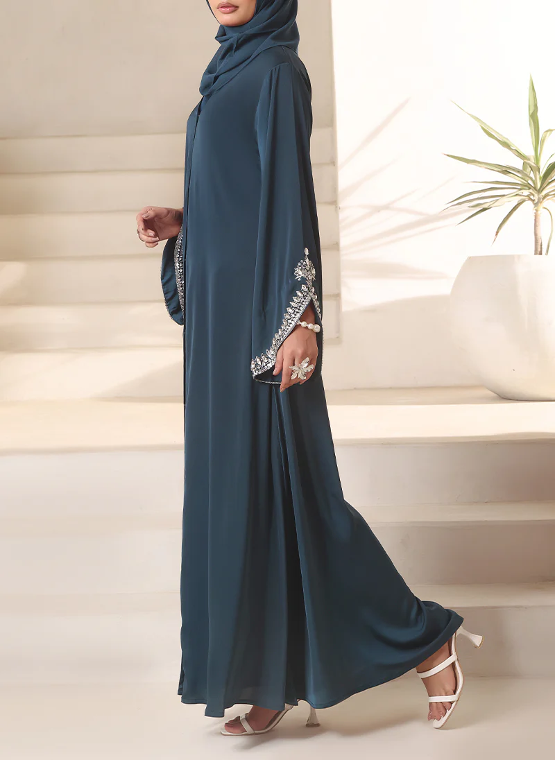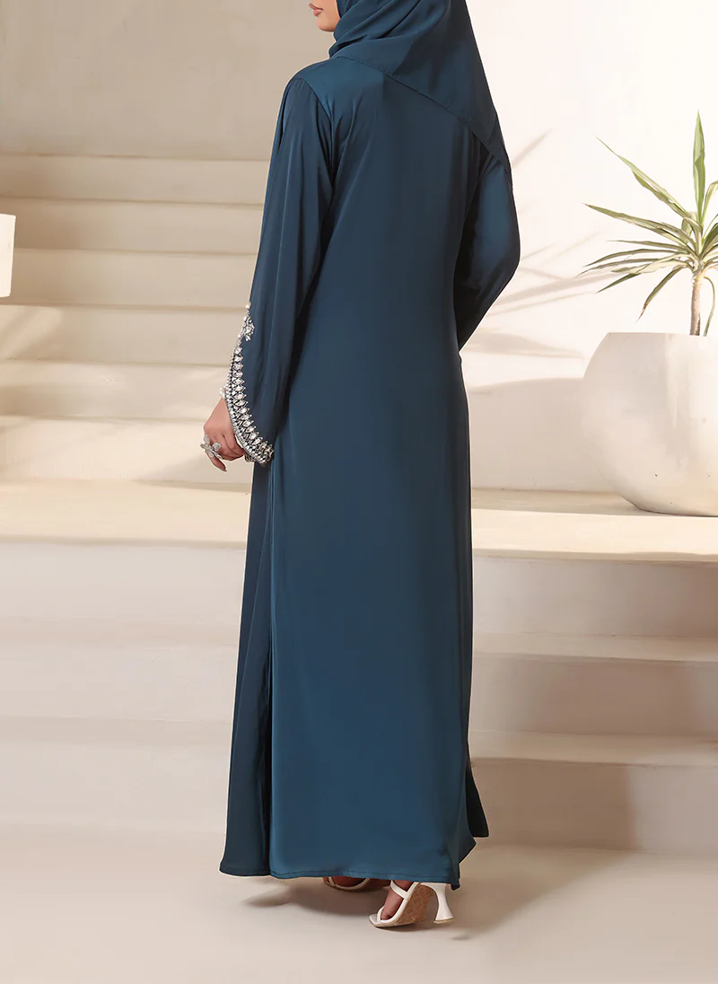 Add a regal touch to your modest wardrobe with Hijab ul Hareem’s Royal Teal Hand Work Abaya. Crafted from soft Nida fabric and adorned with intricate hand embroidery on the sleeves, this elegant piece offers timeless sophistication and comfort.