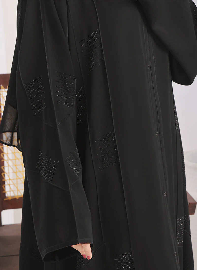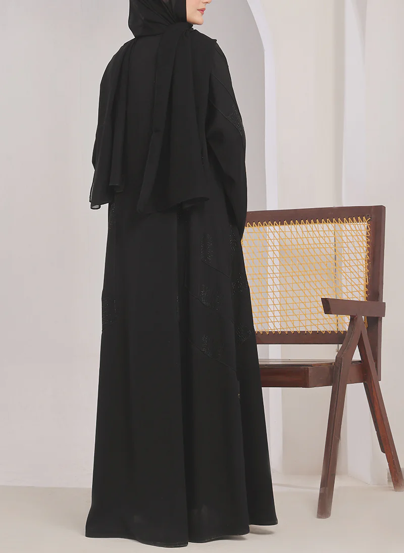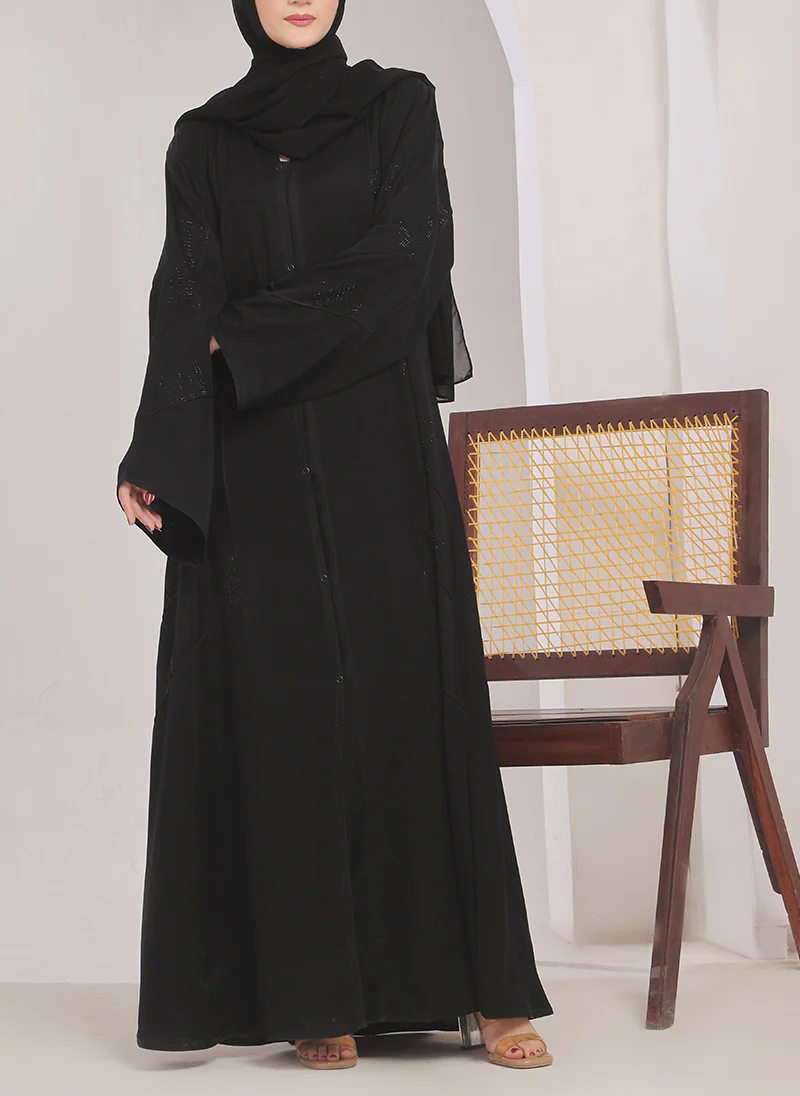 This black abaya features delicate stone work on the front, adding a touch of elegance to your wardrobe. The front open design allows for easy wear and versatility for various occasions. Made from high-quality materials, this abaya is both stylish and comfortable.