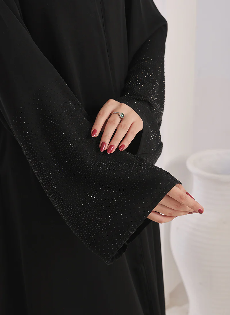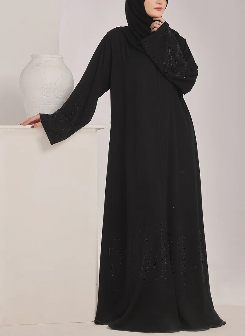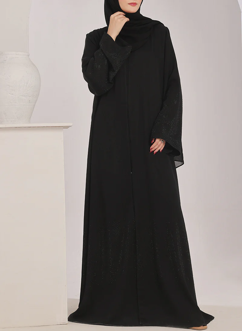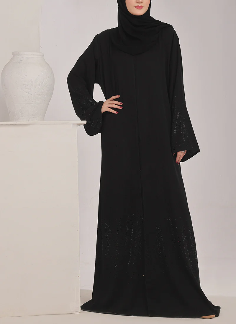 This Stone work Front Open Black Abaya is a perfect blend of elegance and style. The stunning stone work adds a touch of glamour to the classic black abaya. The front open design allows for easy wear and the flowing fabric ensures comfort and modesty.
