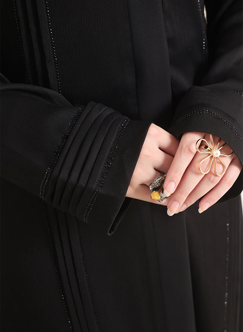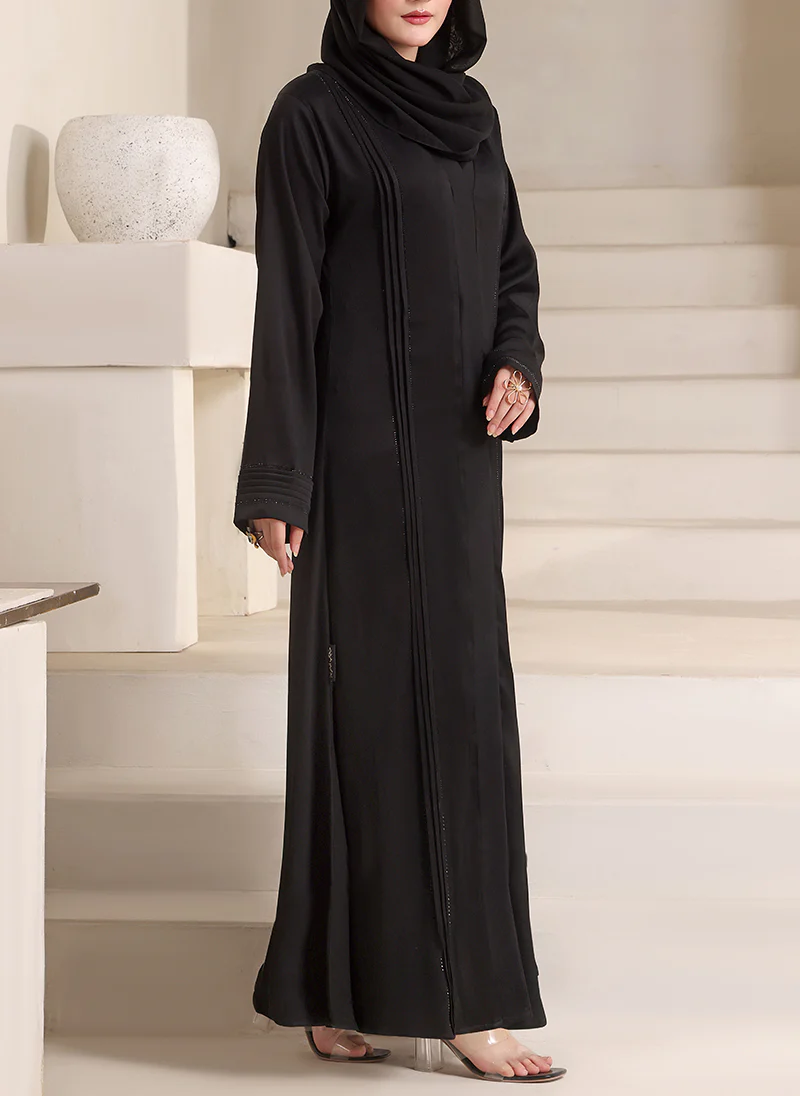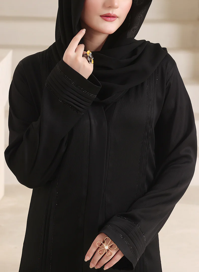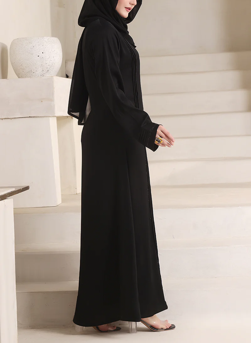 Introducing the Hijab ul Hareem black abaya, a perfect blend of elegance and sophistication. Designed for modern modest wear, this abaya features stylish cuts and delicate stone work on the front panel and sleeves, giving it a refined and graceful look.