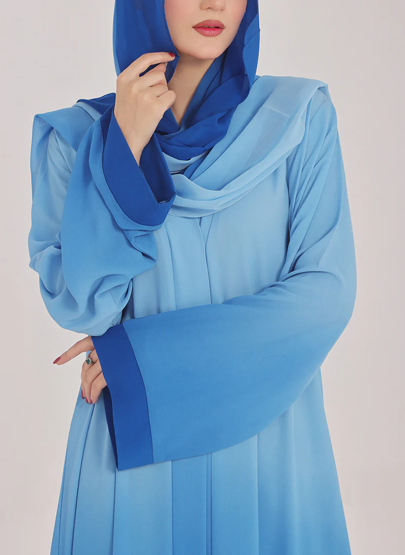 This Two Tone Blue Gradient Abaya - 0116-PR-1015 features a unique two-tone blue gradient design, adding a modern twist to a traditional abaya. Crafted with a soft, plain fabric, this abaya offers both comfort and style.