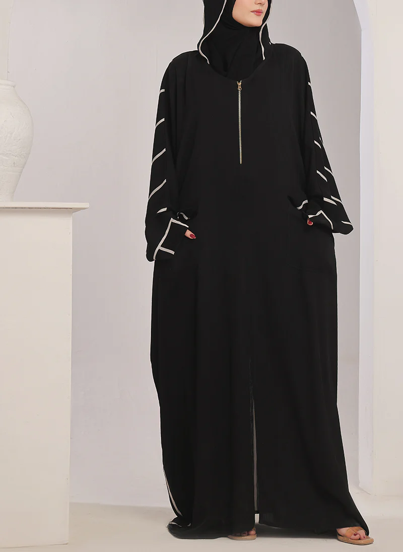 Cover yourself in style and modesty with our White Stripe Hooded Jilbab. This jilbab features a classic design with a modern twist of white stripes, perfect for any occasion. Stay comfortable and chic while maintaining your modesty.